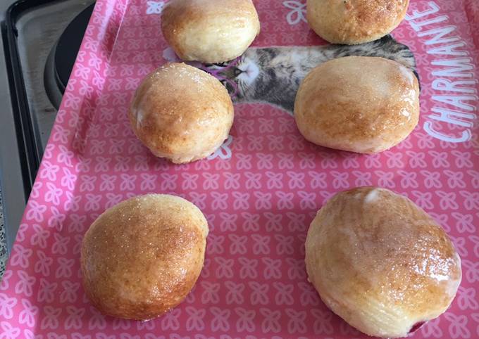 - On sépare la pâte en 8 boules qu’on aplatie en disque on dépose 1 cac de confiture au centre puis on referme les beignets.on les dépose retournés sur la plaque du four recouverte de papier cuisson et on met à cuir 8 à 10 minutes jusqu’à légère coloration..