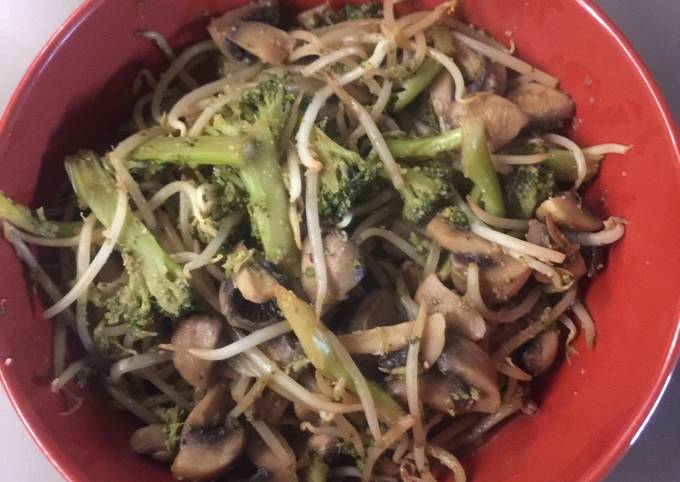 - Faire revenir dans un peu d’huile d’olive l’ail et le gingembre râpés Ajoutez les fleurettes de brocoli, laisser cuire une dizaine de minutes en rajoutant un peu d’eau Puis ajoutez les champignons et continuez la cuisson 5-6 mn Ajoutez ensuite les pousses de soja, mélanger Ajoutez la sauce tamari, l’huile de sésame Remuez et laissez cuire quelques instants.