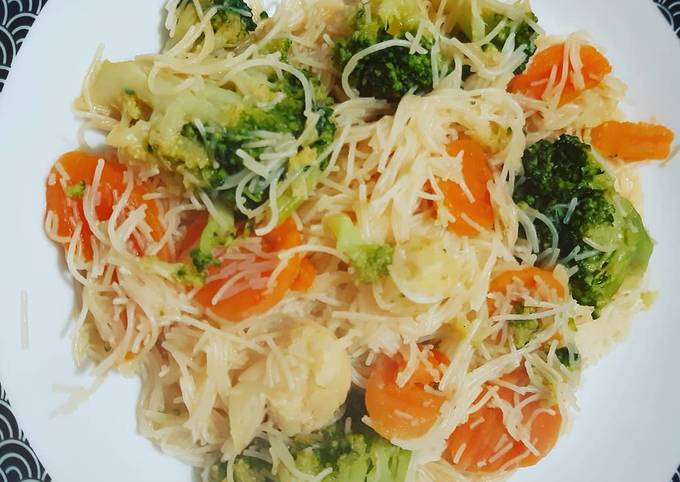 - Quand les nouilles de riz sont prêtes les mélanger avec les légumes.rajouter la sauce soja, la sauce maggi, l'ail en poudre, poivre. Faire cuire 10 petites minutes tout en remuant. Bonne appétit !🤤🤤🤤🤤.