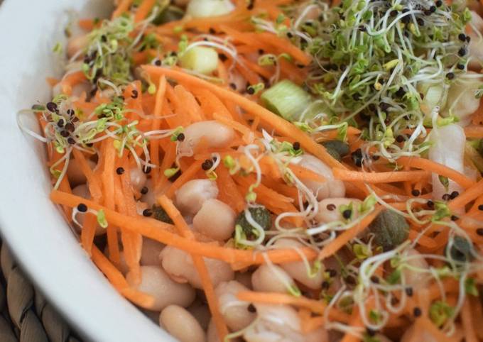 - Eplucher, laver et râper les carottes. Emincer les oignons. Egoutter les haricots. Préparer la vinaigre. Dans un saladier, réunir tous les ingrédients, arroser avec la vinaigrette, mélanger, déposer les graines germées et servir..