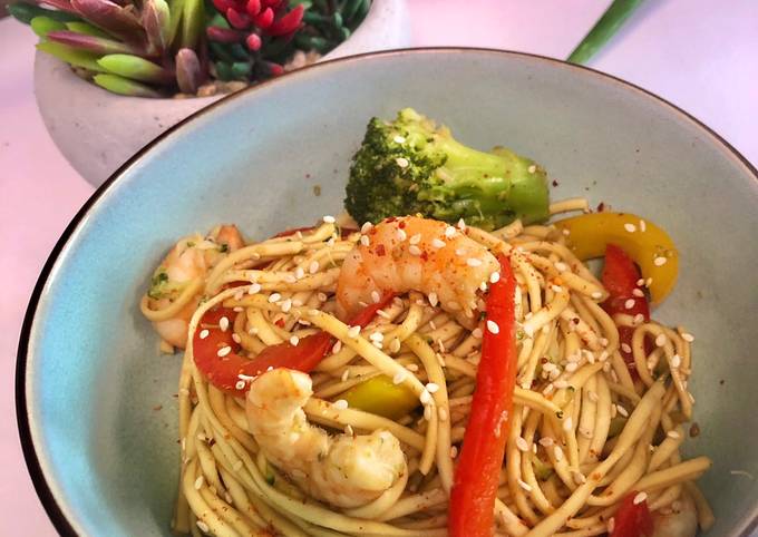 Recette: Parfait Wok de nouilles - crevettes - sésames 🇨🇳